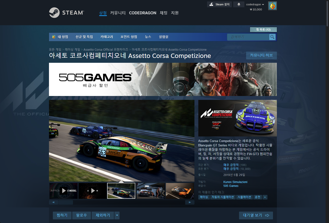 "Assetto Corsa Competizione" Steam 스팀 게임 페이지