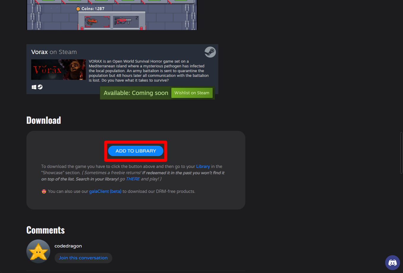 "ReX" 게임 페이지를 내려 [ADD TO LIBRARY]를 클릭합니다.