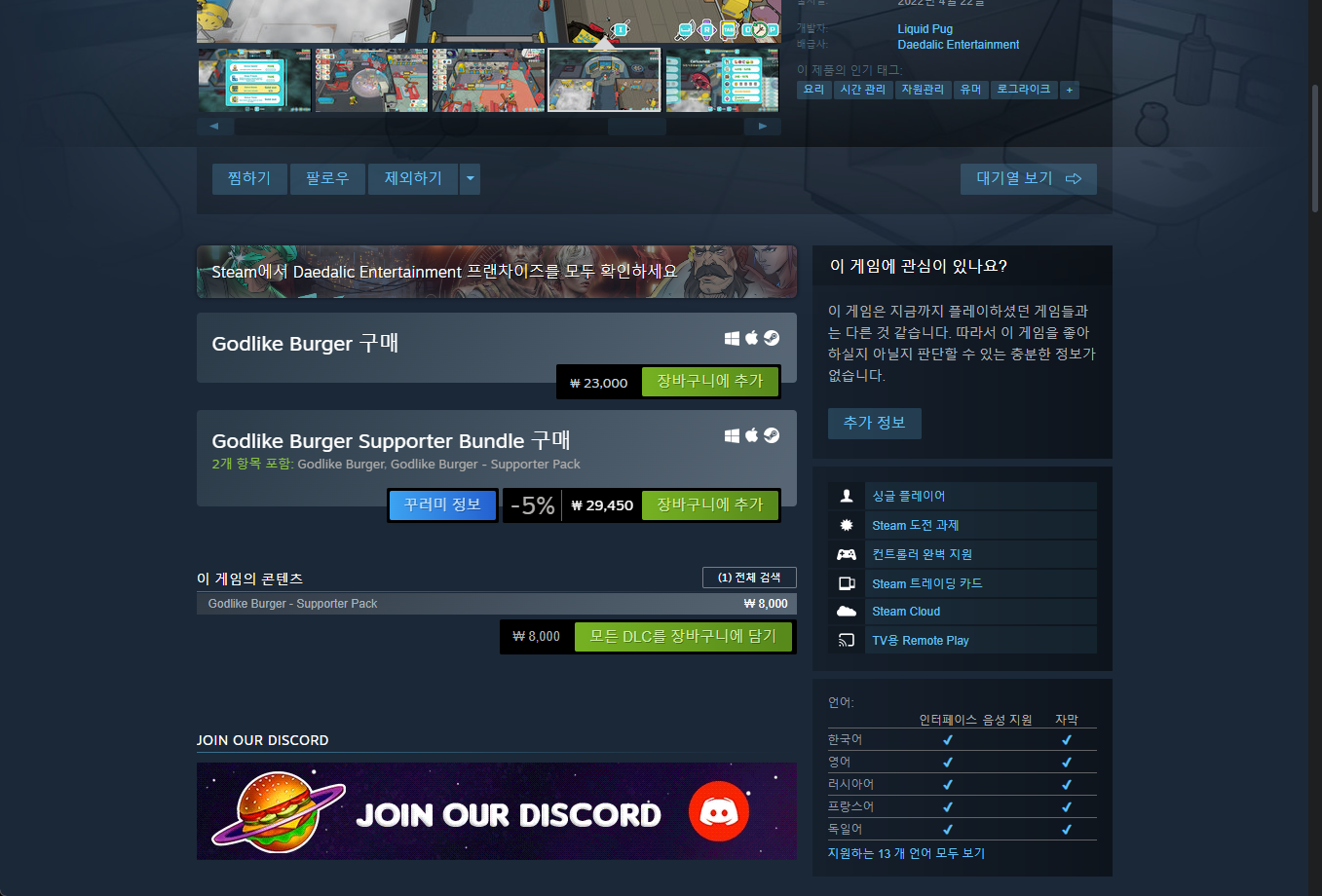 "Godlike Burger" - Steam 스팀 게임 페이지