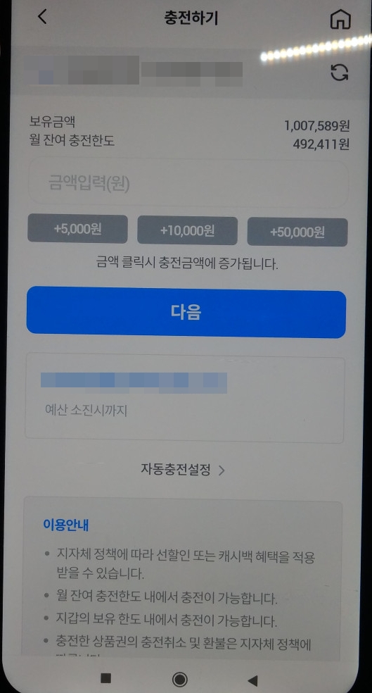 아래 이미지를 예로 설명하면 최대 충전한도 50만원, 최대 보유 금액 한도 150만원입니다. 그래서 최대 50만원을 충전하지 못하고 492,411원만 충전할 수 있고 최대 충전한도인 492,411원 충전하게되면 최대 보유금액 150만원이됩니다.