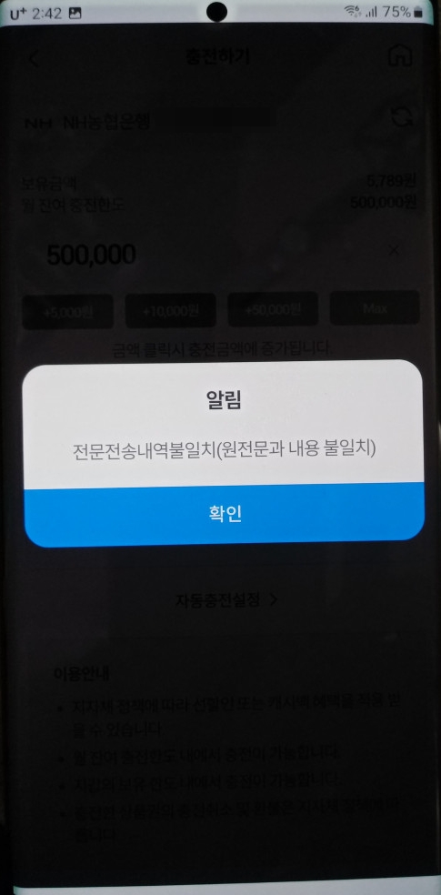 저같은 경우 농협통장으로 충전할때 전문전송내역불일치(원전문과 내용 불일치) 에러와함께 충전이 계속 실패했고 기업은행으로 바꿔서 충전하니 한번에 충전되었습니다.