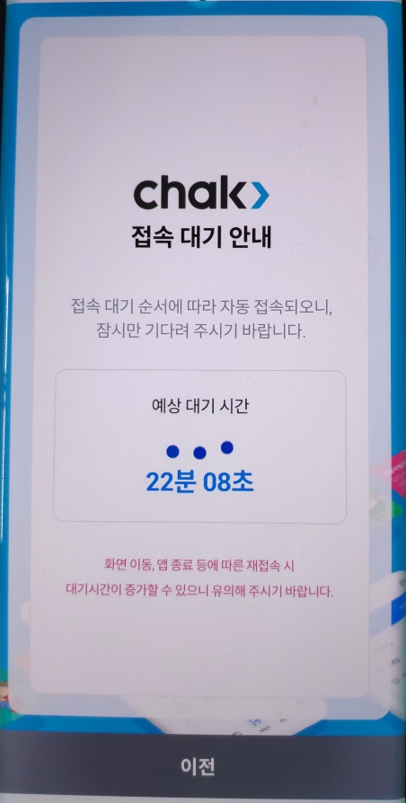 접속자가 많은 경우 발생할 수 있고 지속해서 발생한다면 기존에 설치되어 있는 모바일앱 삭제후 폰 재부팅 후 착 모바일앱 다시 설치해 보시기 바랍니다.