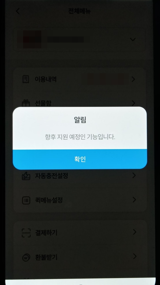 보이는 화면을 예로들면 새로운 기능(자동 충전 설정)이 추가된 상태이지만 아직 개발완료 전이라 보이는 것처럼 알림을 통해 사용할 수 없다고 나오고 있습니다.