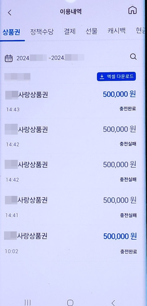지역사랑 모바일 상품권 충전시 충전실패가 나며 전문전송내역불일치(원전문과 내용 불일치)라는 에러 메시지가 나오면서 충전 되지 않습니다.