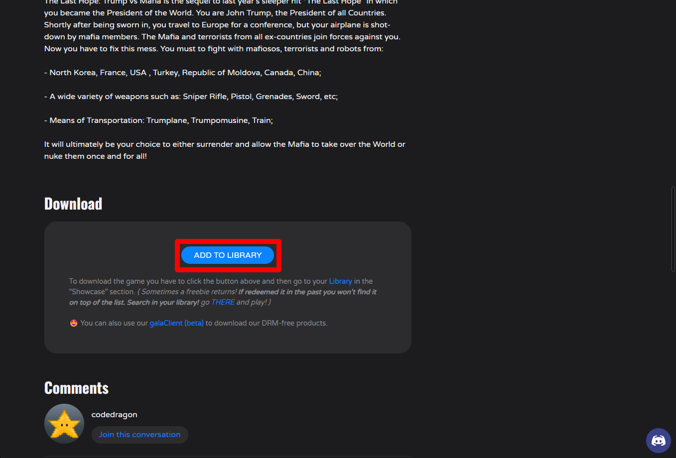 "The Last Hope Trump vs Mafia" 게임 페이지를 내려 [ADD TO LIBRARY]를 클릭합니다.