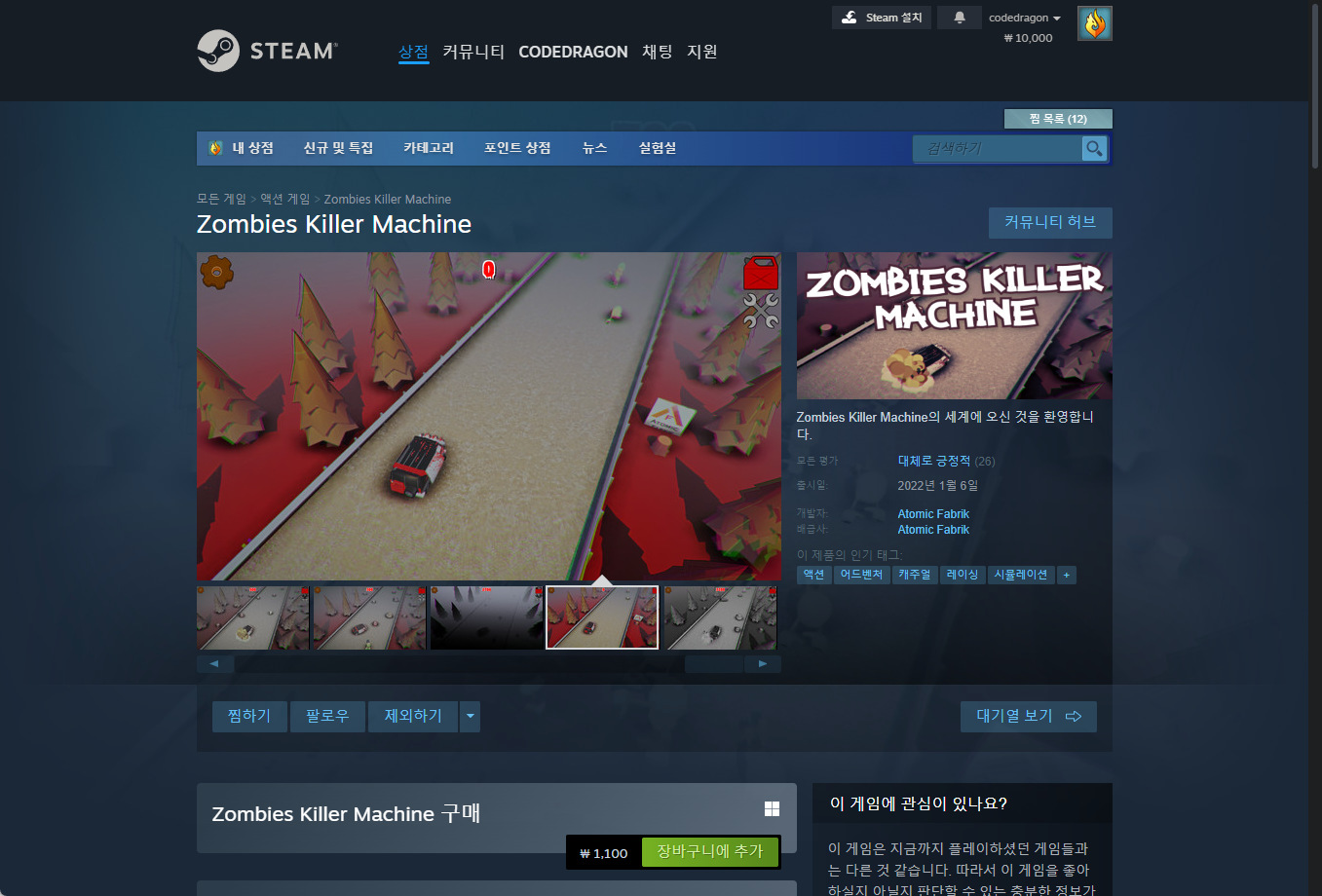 "Zombies Killer Machine" 게임 스팀 페이지입니다.