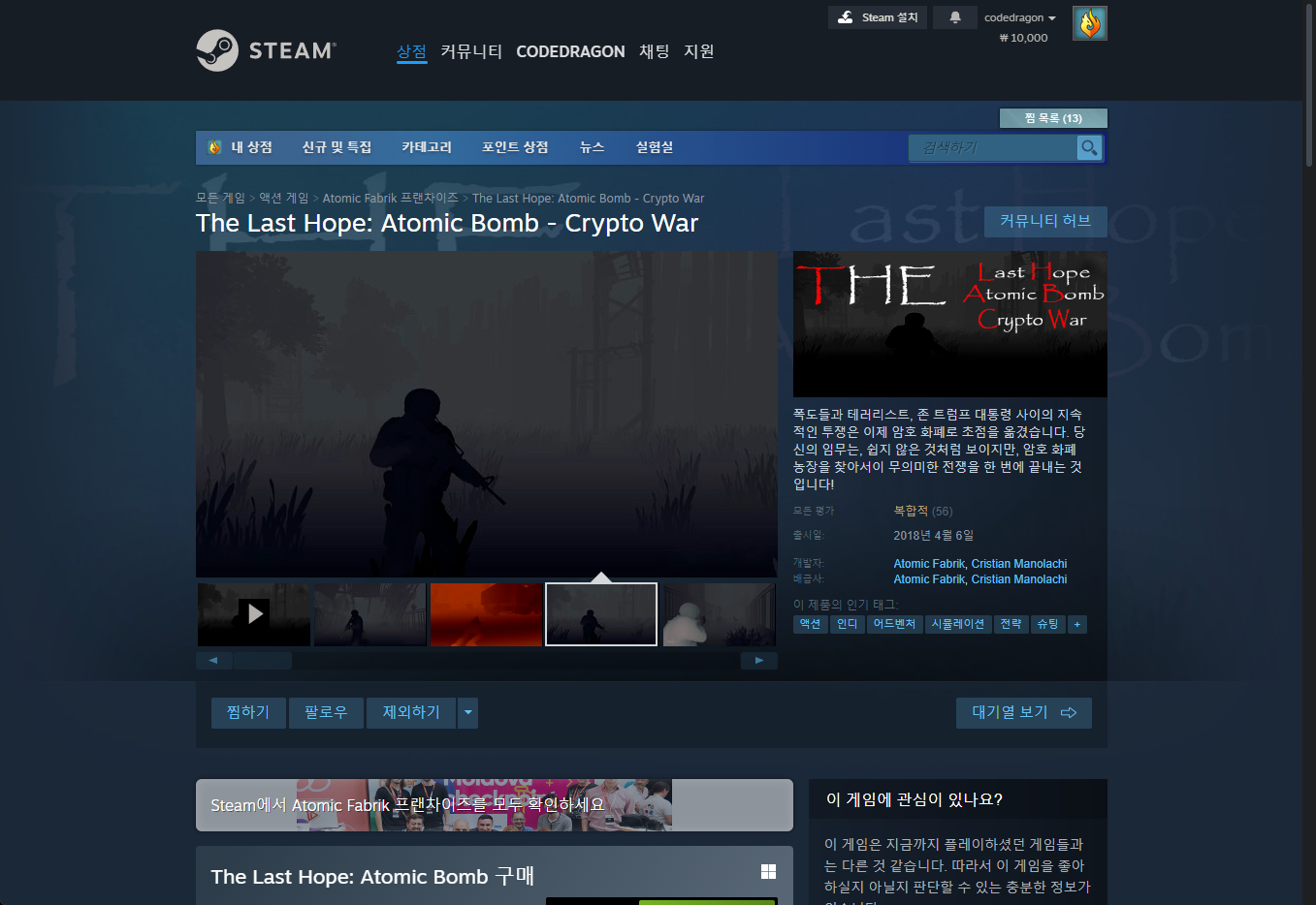 "The Last Hope: Atomic Bomb - Crypto War" 게임 스팀 페이지입니다.
