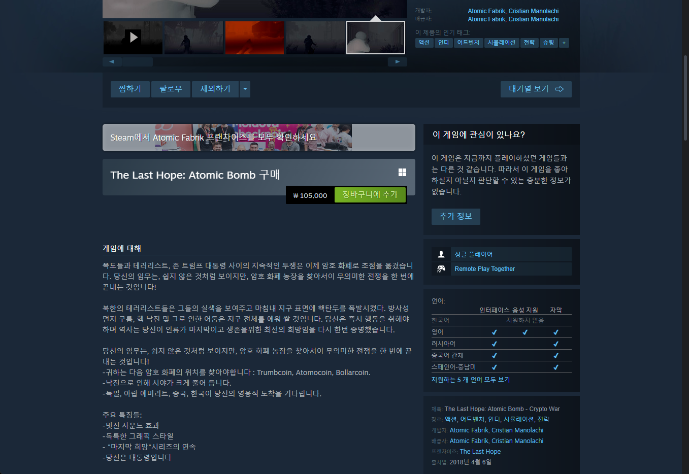 "The Last Hope: Atomic Bomb - Crypto War" 게임 스팀 페이지입니다.