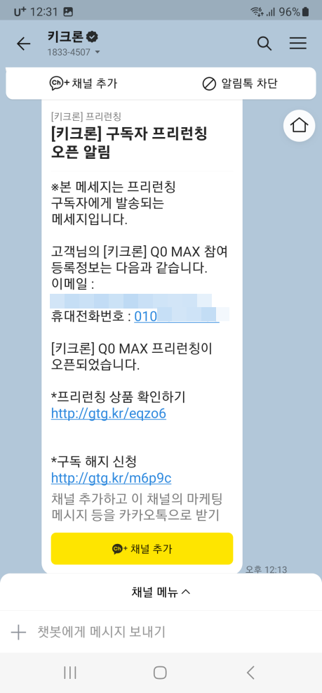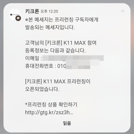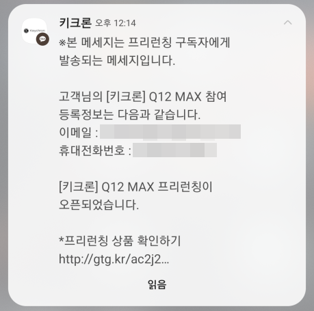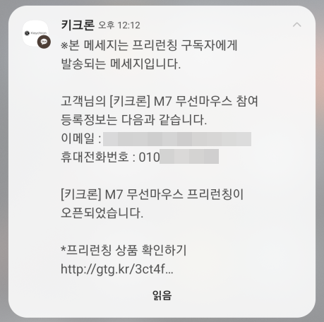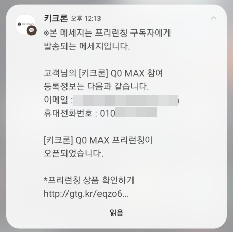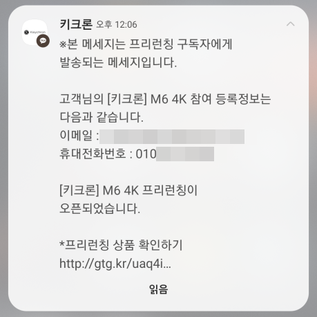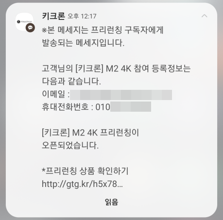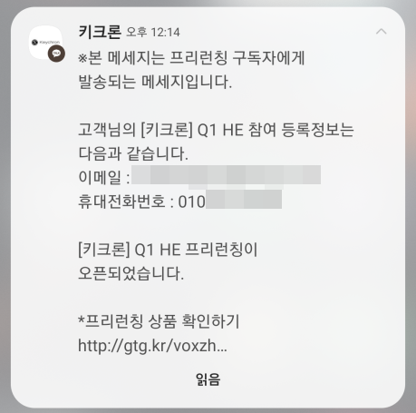 저는 "프리런칭 구독신청" 항목에 체크했기때문에 제품 출시를 위한 프리런칭이 진행되면 카카오톡 메시지로 확인할 수 있습니다.