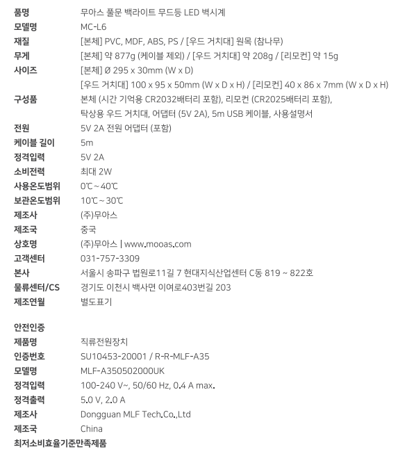 - mooas 무아스 풀문 백라이트 무드등 LED 벽시계 제품 사양