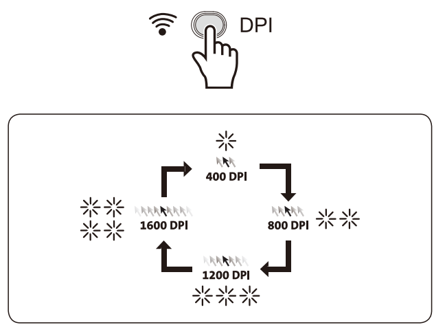 400, 800, 1200, 1600 DPI를 우측 버튼을 누르면 돌아가면서 선택되어지므로 작업에 맞는 커서 속도로 조절할 수 있습니다.