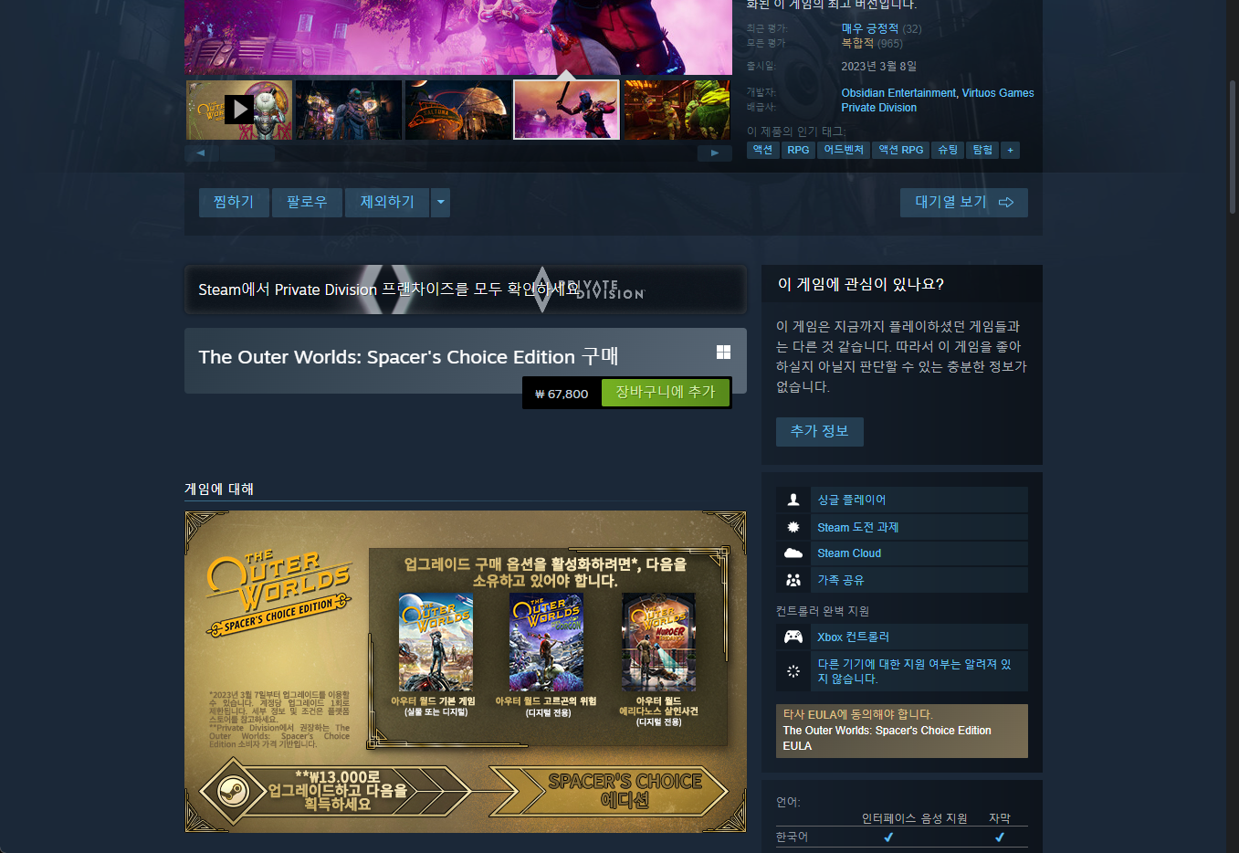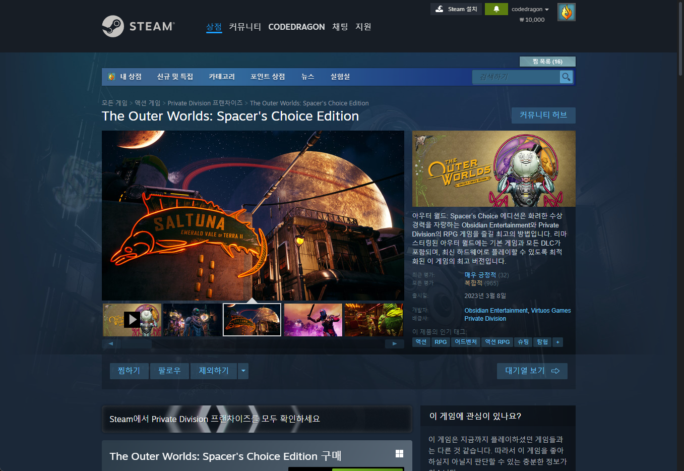 - "The Outer Worlds: Spacer's Choice Edition" - Steam 스팀 게임 페이지