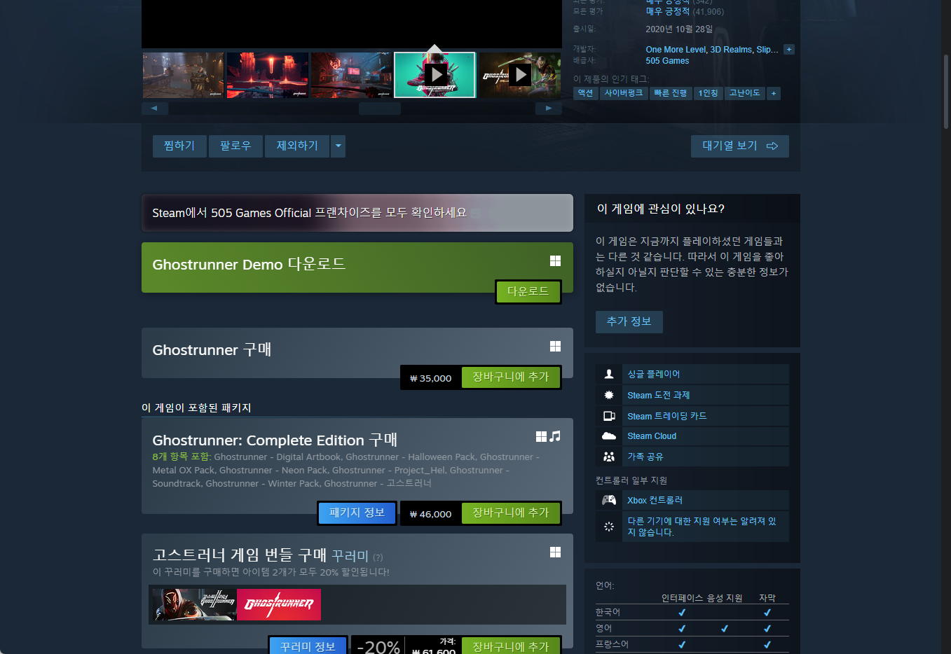 "Ghostrunner" - Steam 스팀 게임 페이지