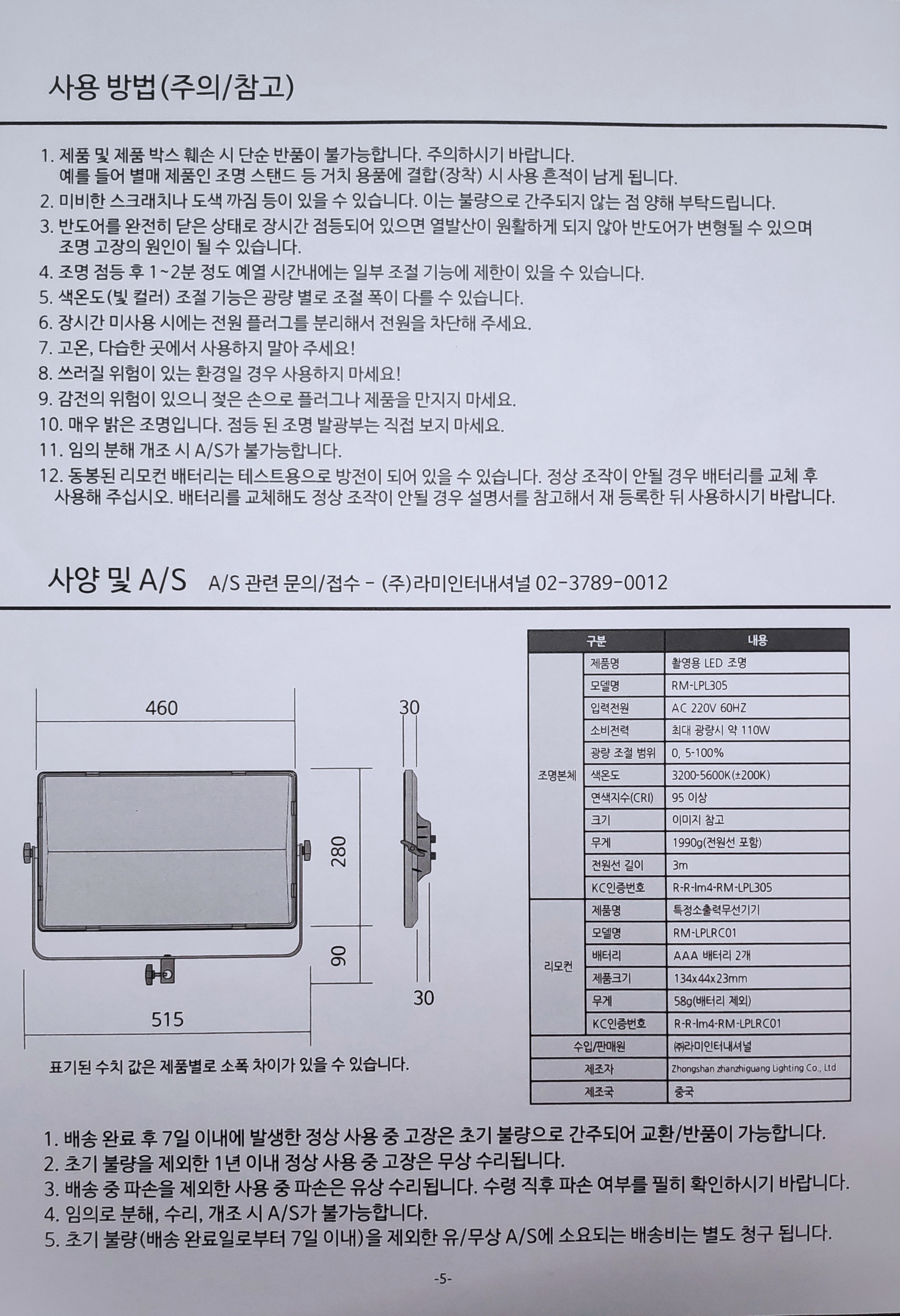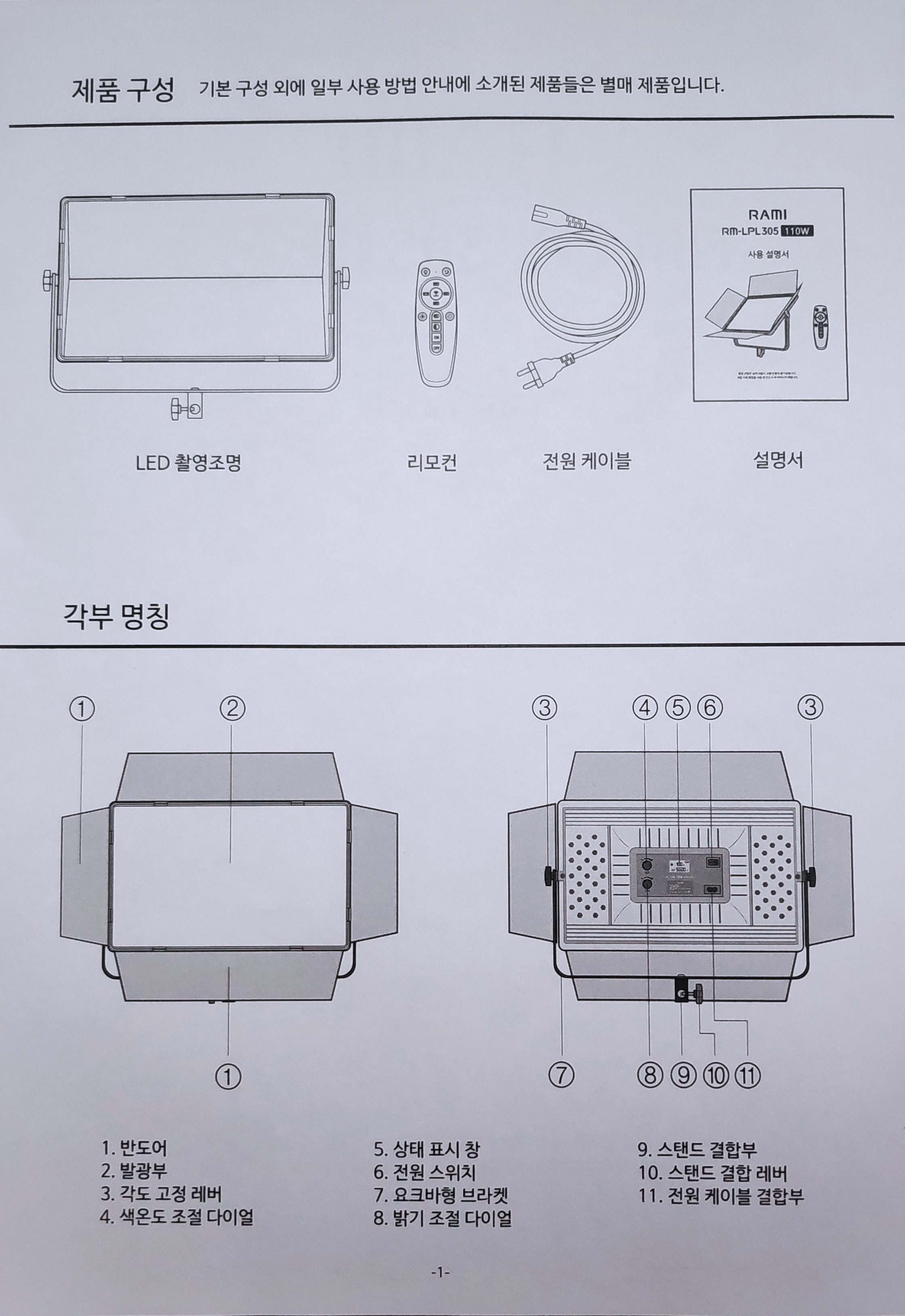 RAMI 라미 110W급 패널형 조명 RM-LPL305 개인방송 유튜브 영상 사진 촬영 지속광 조명 사용 설명서 Manual