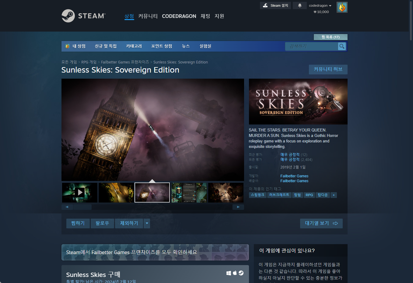 - "Sunless Skies: Sovereign Edition" - Steam 스팀 게임 페이지