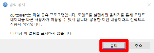 qBittorrent 최초 설치 후 프로그램 실행하면 경고창 나타납니다.