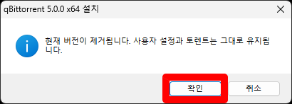 이전 버전 사용하고 있다면 이전 버전 삭제되지만 설정 정보과 토렌트 파일은 그대로 유지된다는 알림 메시지 오픈됩니다.