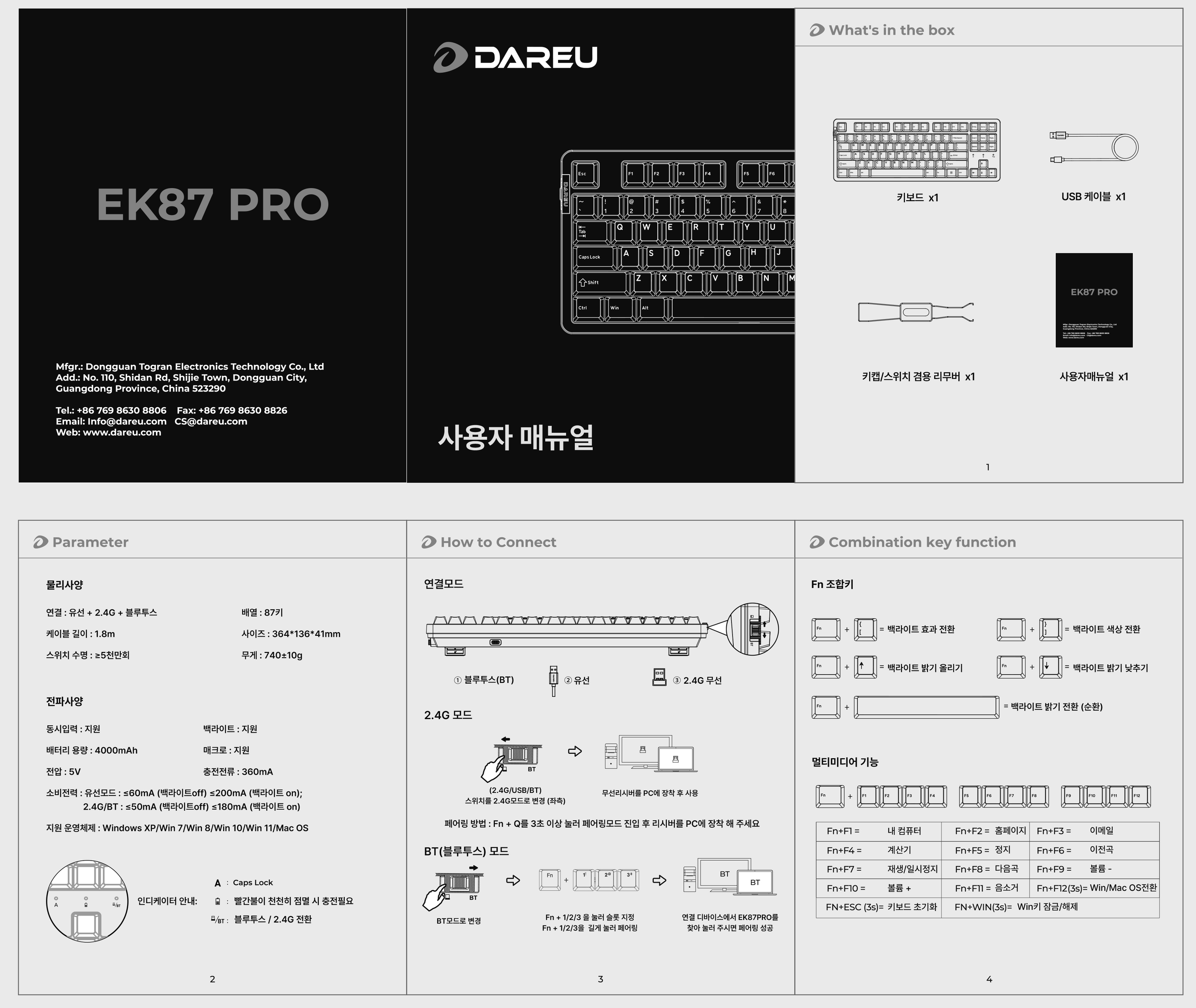 DAREU 다얼유 EK87PRO 무선 기계식 키보드 텐키리스 클라우드축, 제품정보, pdf, 통합소프트웨어/펌웨어 설치파일, setupfile, 사용설명서, Unboxing 언박싱