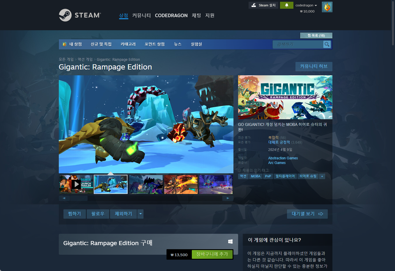 ₩20,400 → ₩0(FREE) Gigantic: Rampage Edition 자이겐틱: 램페이지 에디션 무료로 받기 영구소장; 에픽 게임즈 epic games EGS 한시적 무료 Get free copy