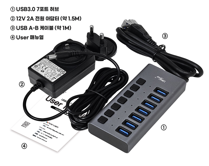 - "LanStar 랜스타 USB3.0 7포트 유전원 허브" 제품 구성품