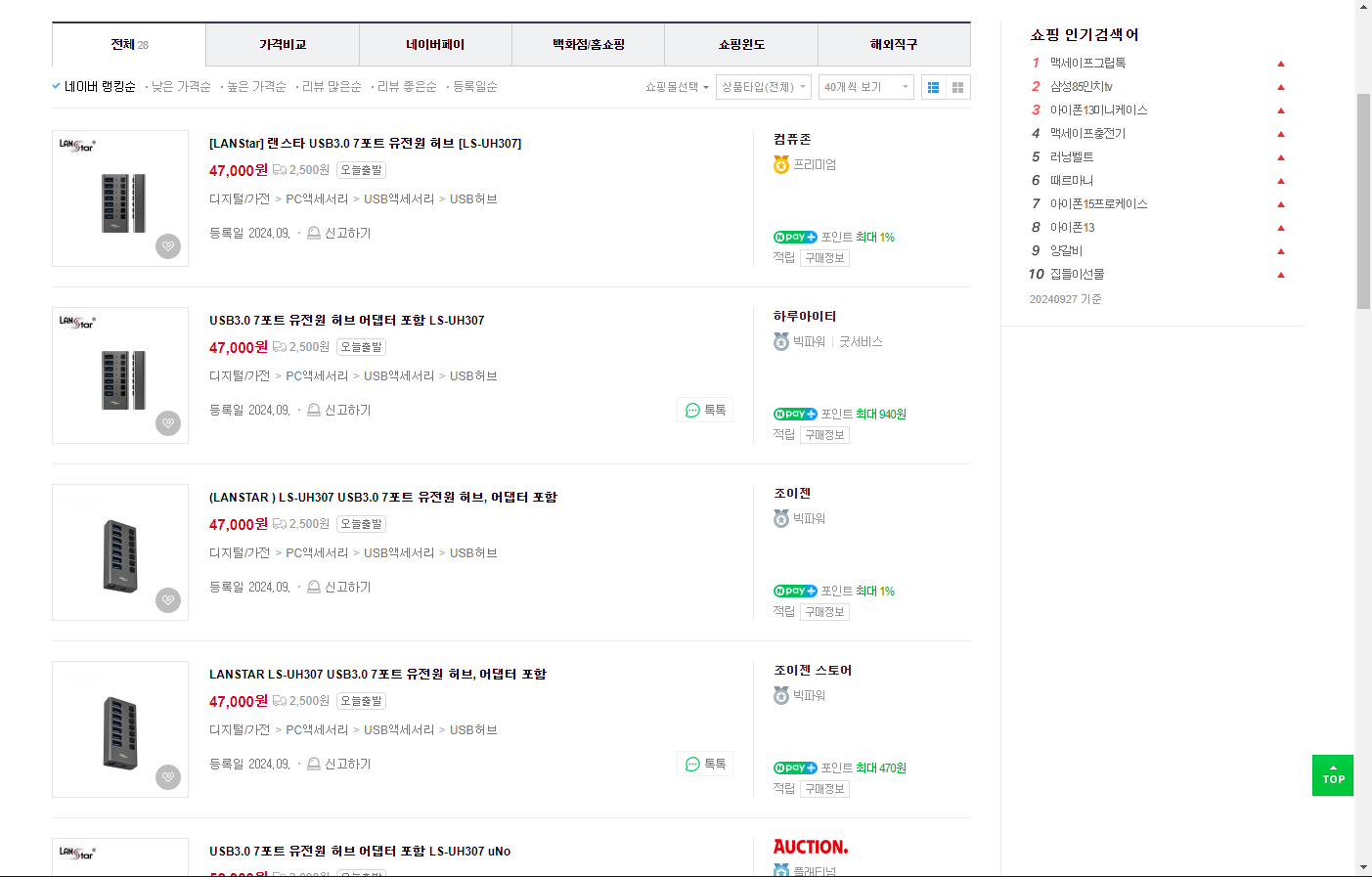 - "LanStar 랜스타 USB3.0 7포트 유전원 허브" 상세정보