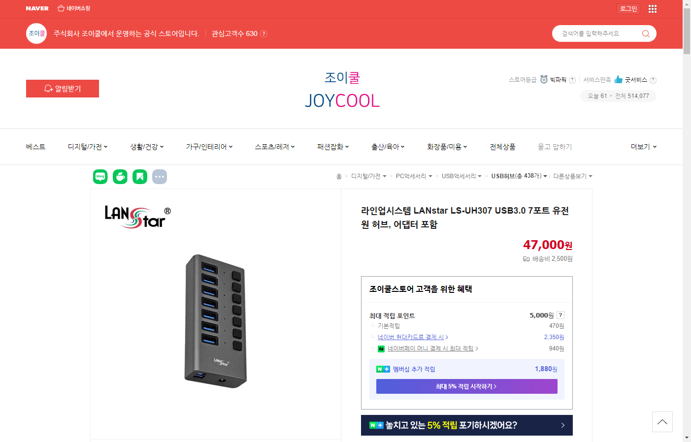 - "LanStar 랜스타 USB3.0 7포트 유전원 허브" 상세정보