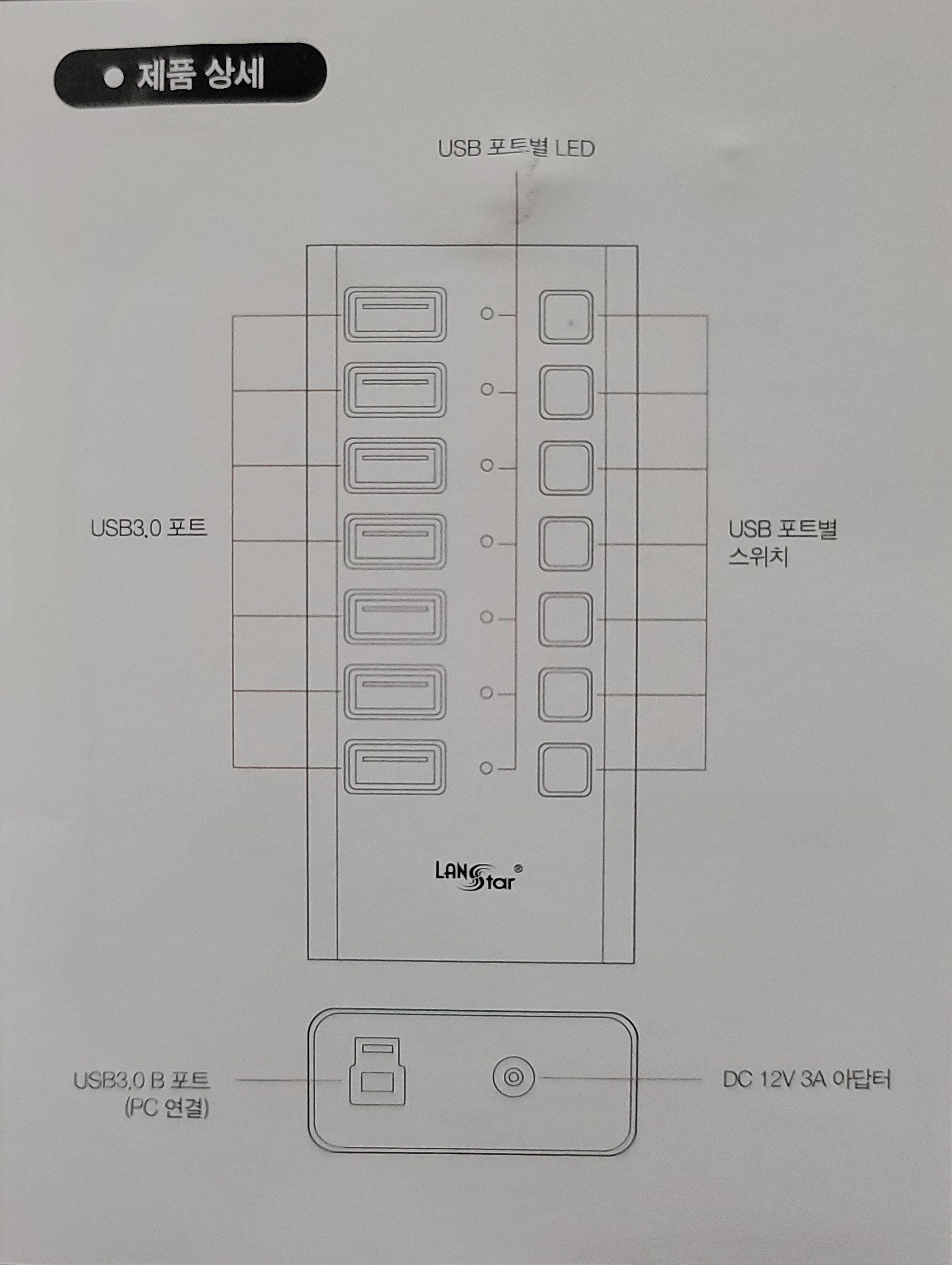 "LanStar 랜스타 USB3.0 7포트 유전원 허브" 제품 구조