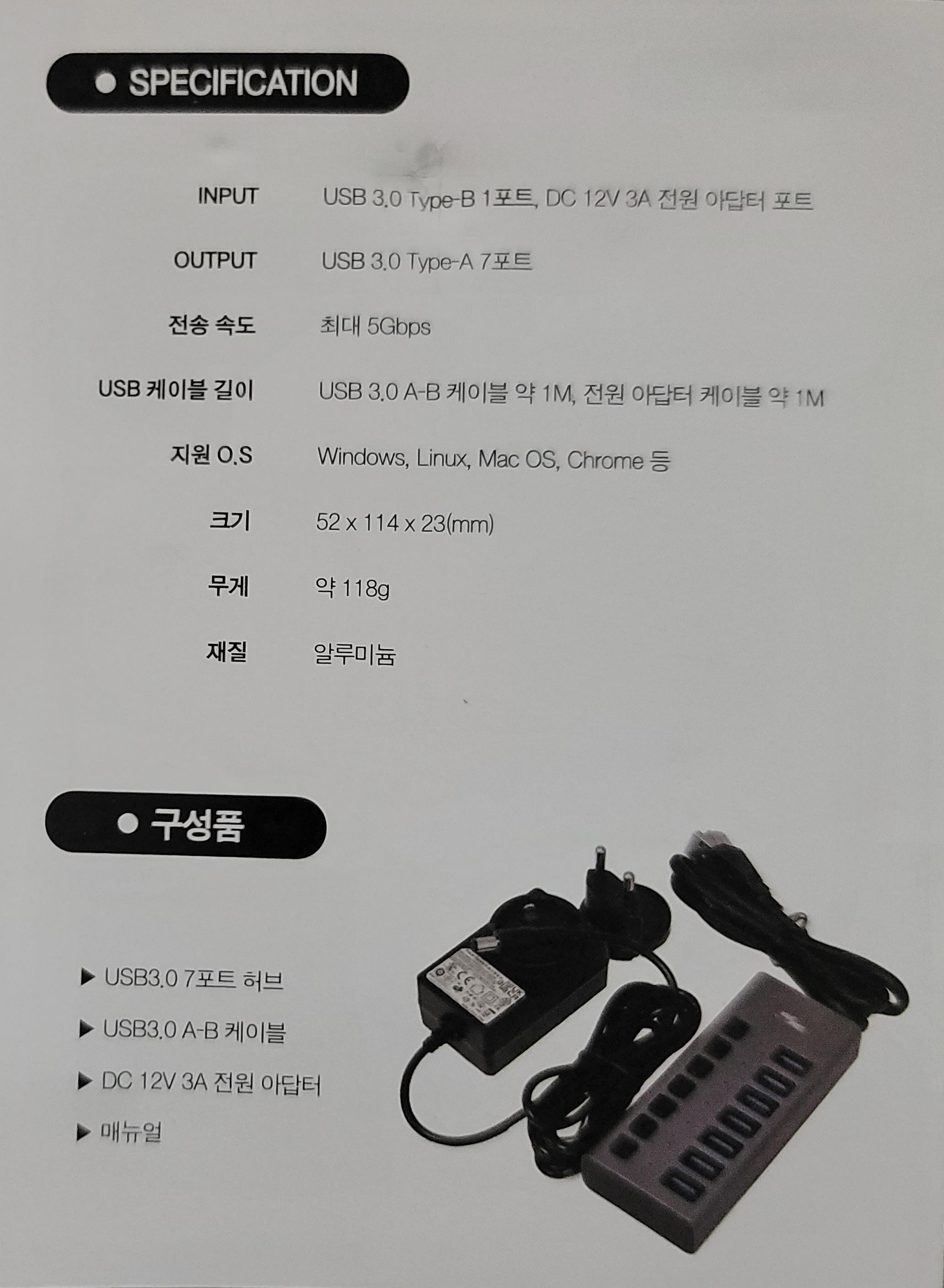 | 품명 | USB3.0 7포트 유전원 허브 |