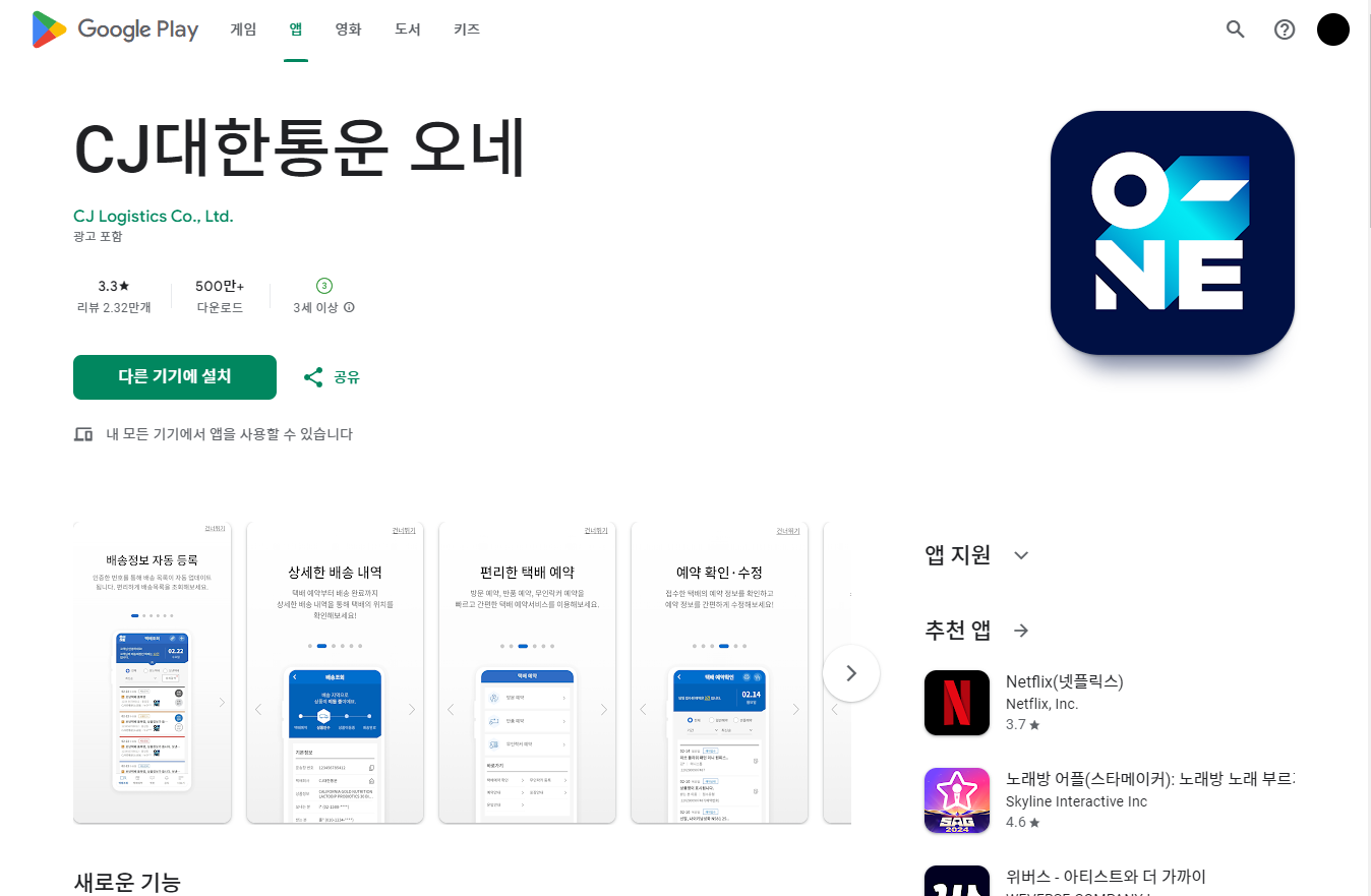 CJ대한통운 오네 택배 어플 install 설치하기 - CJ Logistics,대한통운,한진택배,롯데백배,우체국택배,GS,Postbox,경동택배,천일택배,EMS,로젠택배,일양로지스,택배사