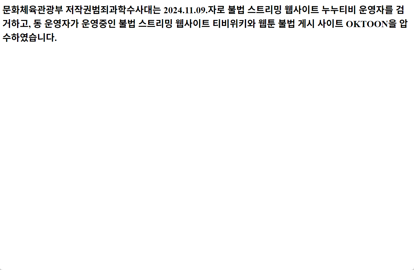 문화체육관광부 저작권범죄과학수사대는 2024.11.09.자로 불법 스트리밍 웹사이트 누누티비 운영자를 검거하고, 동 운영자가 운영중인 불법 스트리밍 웹사이트 티비위키와 웹툰 불법 게시 사이트 OKTOON을 압수하였습니다.