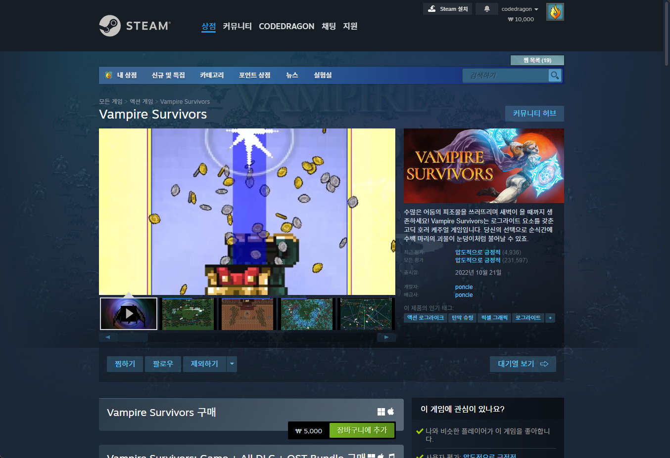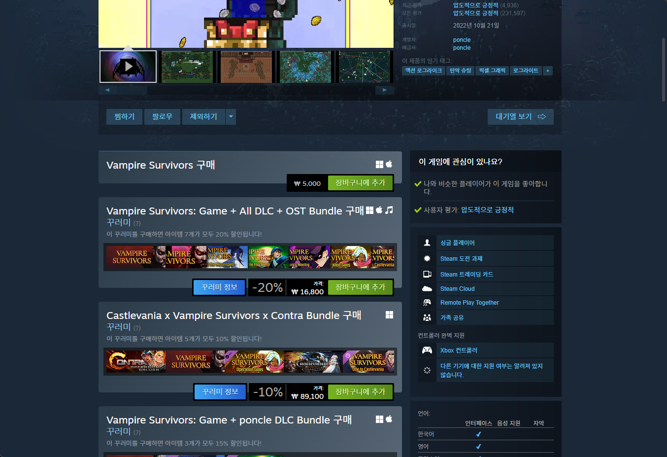 "Vampire Survivors" - Steam 스팀 게임 페이지