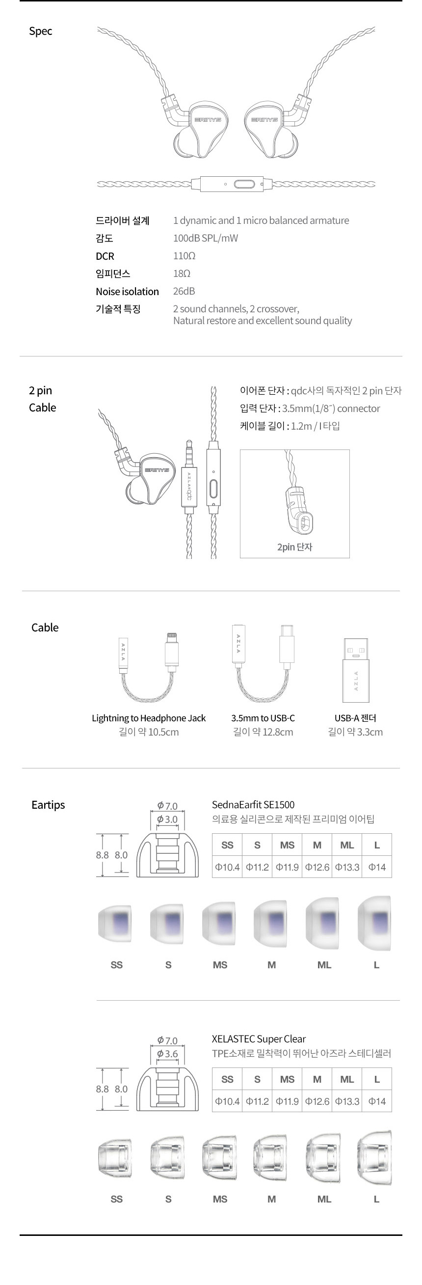- "AZLA 아즈라 X qdc 뉴미디어 고음질 유선이어폰 에리니스 2" 제품스펙