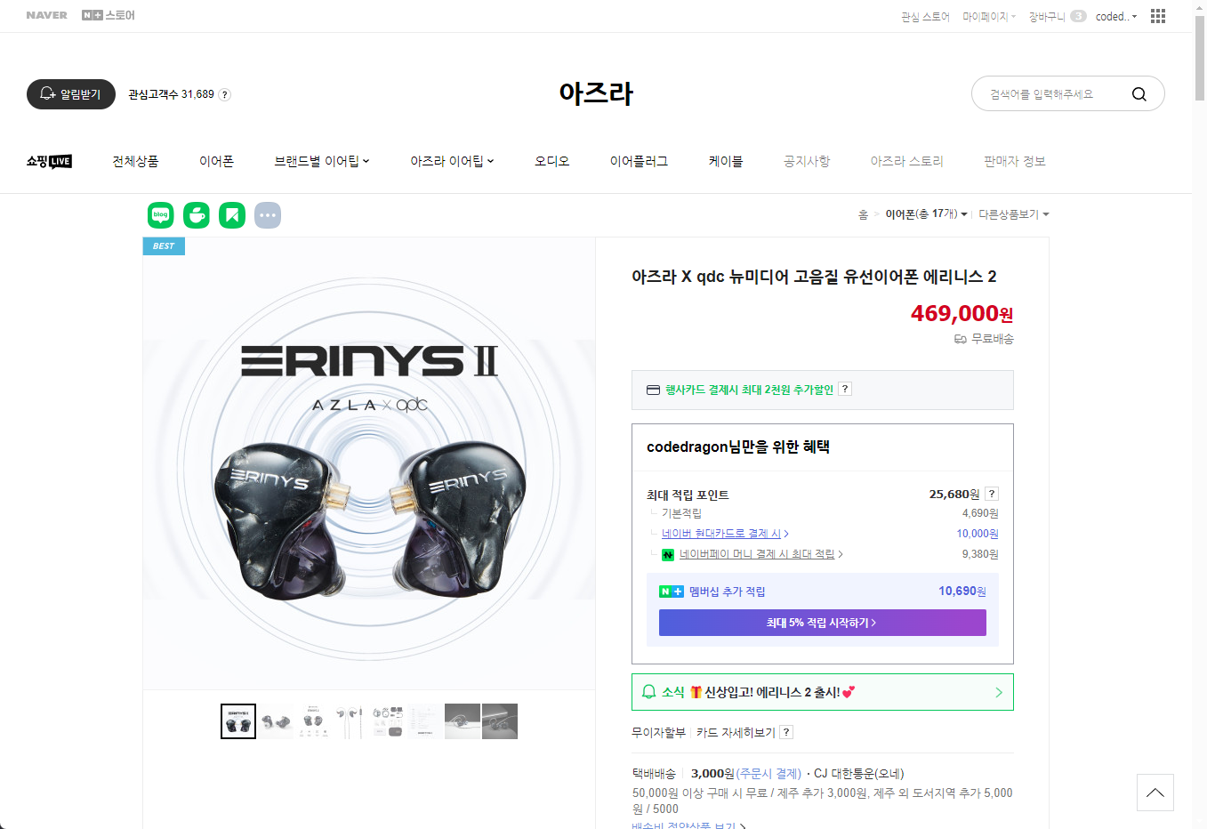 아즈라 X qdc 뉴미디어 고음질 유선이어폰 에리니스 제품 상세정보 보러가기