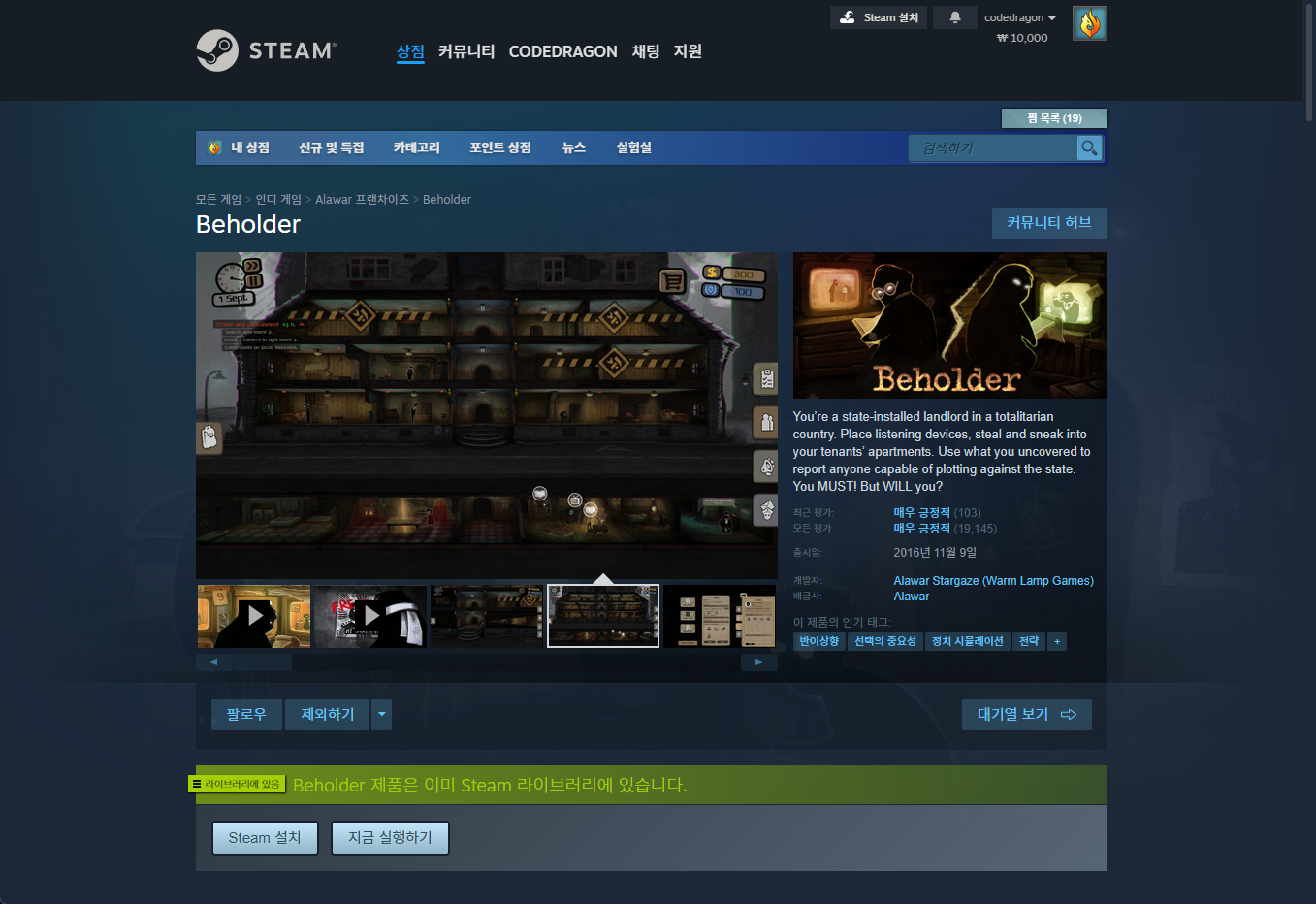 ₩15,500 → ₩0(FREE) Beholder 비홀더 무료로 받기 영구소장; 에픽 게임즈 epic games EGS 한시적 무료 Get free copy