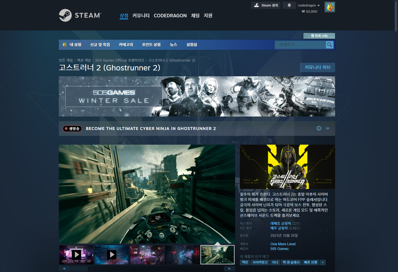 - "Ghostrunner 2" 한시적 무료게임 구매하기