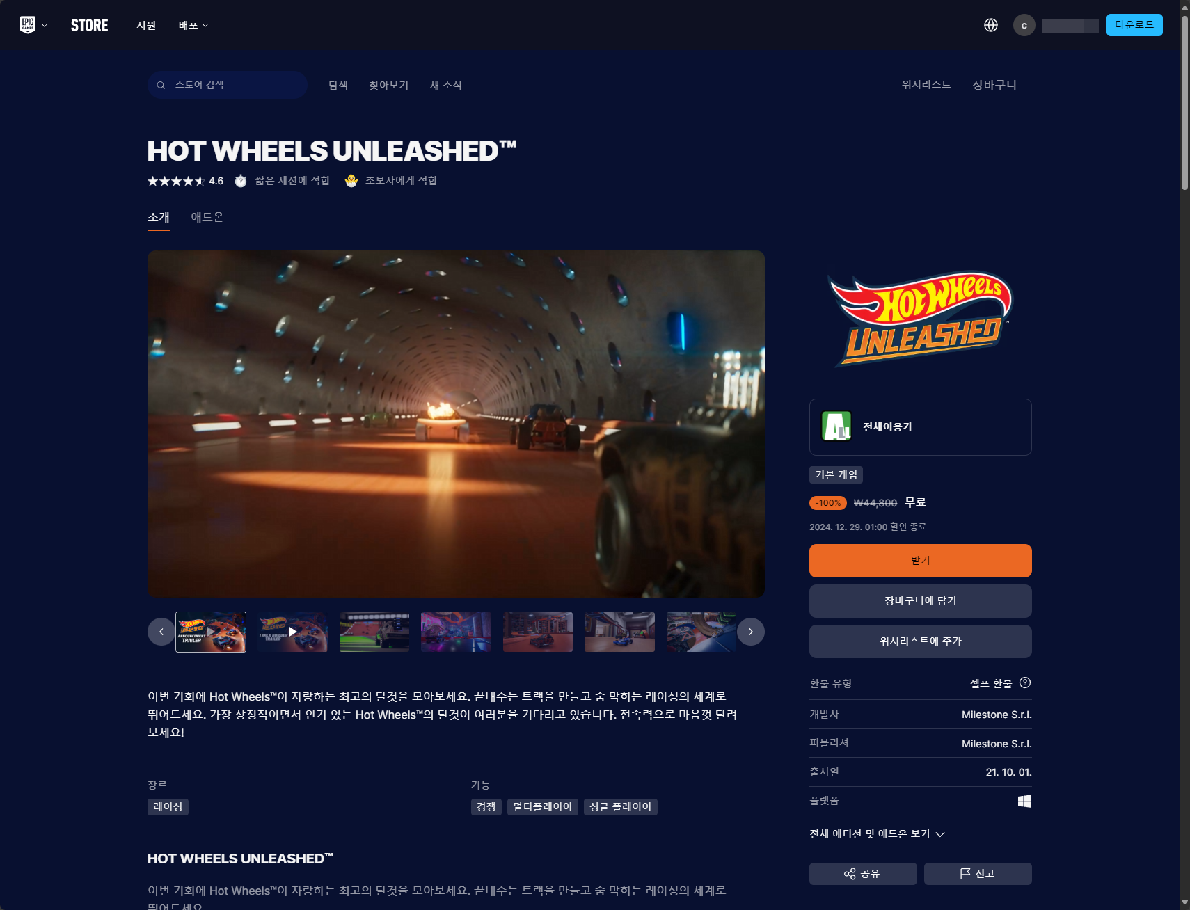 ₩44,800 → ₩0(FREE) HOT WHEELS UNLEASHED 핫 휠 언리쉬드 무료로 받기 영구소장; 에픽 게임즈 epic games EGS 한시적 무료 Get free copy