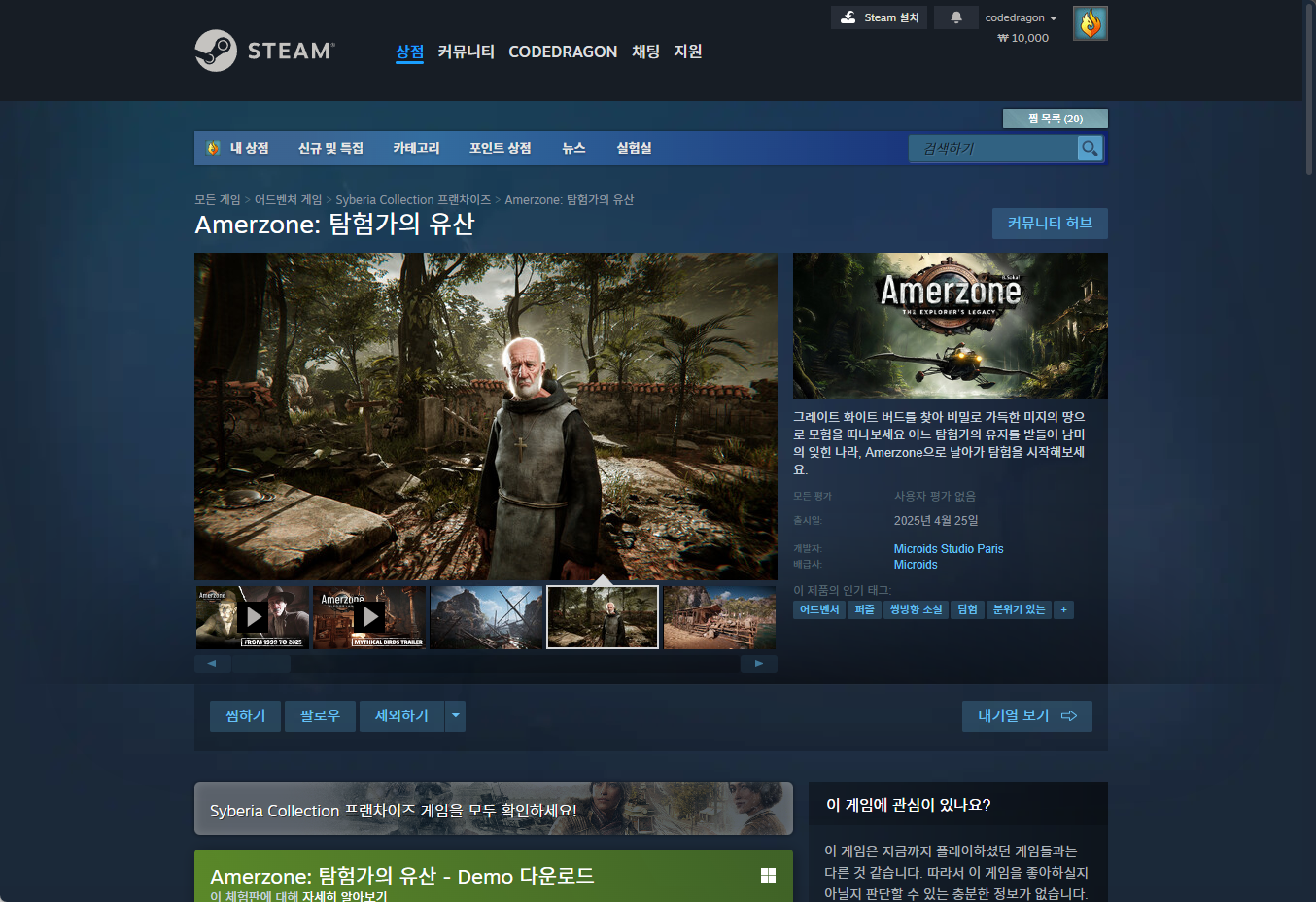 ₩15,000 → ₩0(FREE) Amerzone: The Explorer’s Legacy (1999) 아머존: 익스플로러 레거시 무료 소장하기; 스팀 Steam 한시적 무료 Get free copy