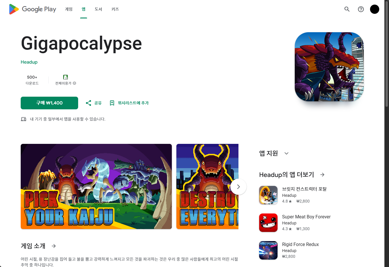 "Gigapocalypse" - 구글 플레이 스토어 Google Play Store 게임 페이지