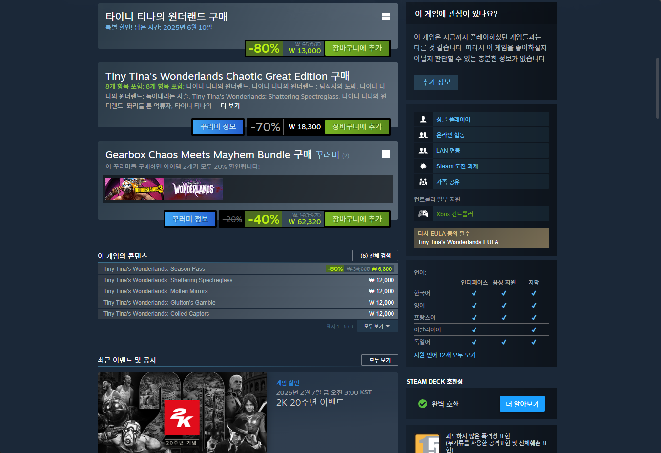 - "Tiny Tina's Wonderlands (타이니 티나의 원더랜드)" - Steam 스팀 게임 페이지
