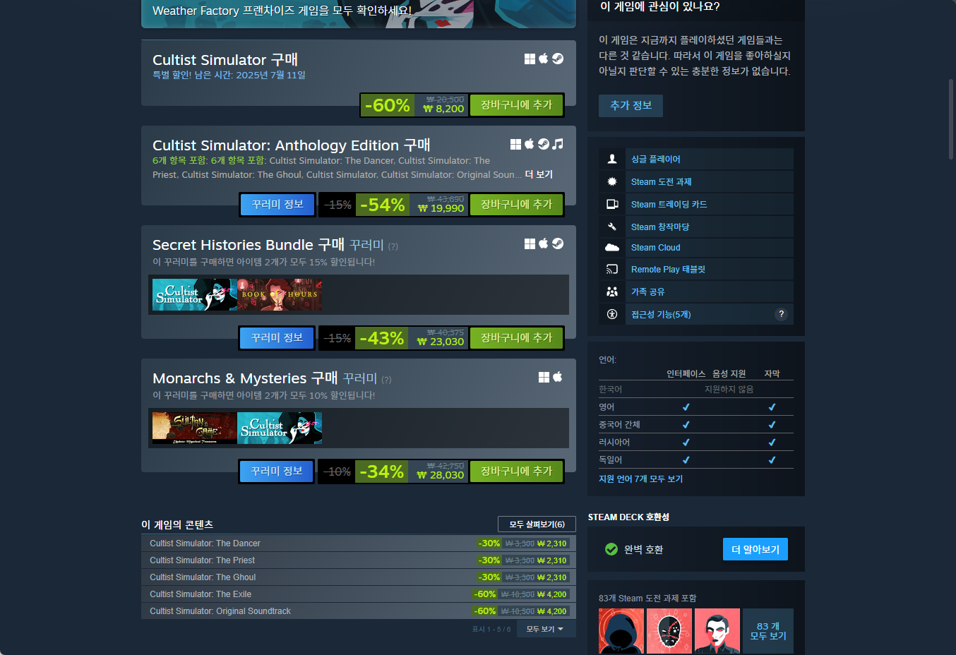 - "Cultist Simulator (컬티스트 시뮬레이터)" - Steam 스팀 게임 페이지