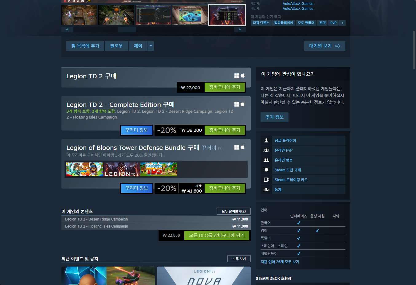 - "Legion TD 2 (레기온 TD 2)" 게임 보유 확인