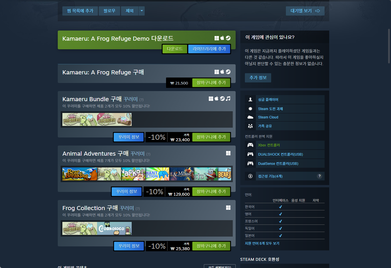 - "Kamaeru: A Frog Refuge (카마에루: 어 프로그 레퓨지)" 게임 보유 확인