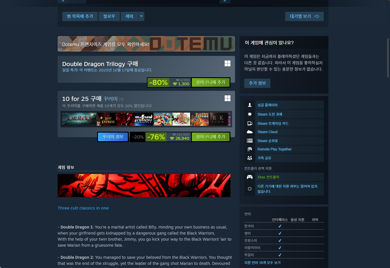 - "Double Dragon Trilogy (더블 드래곤 트릴로지)" - Steam 스팀 게임 페이지