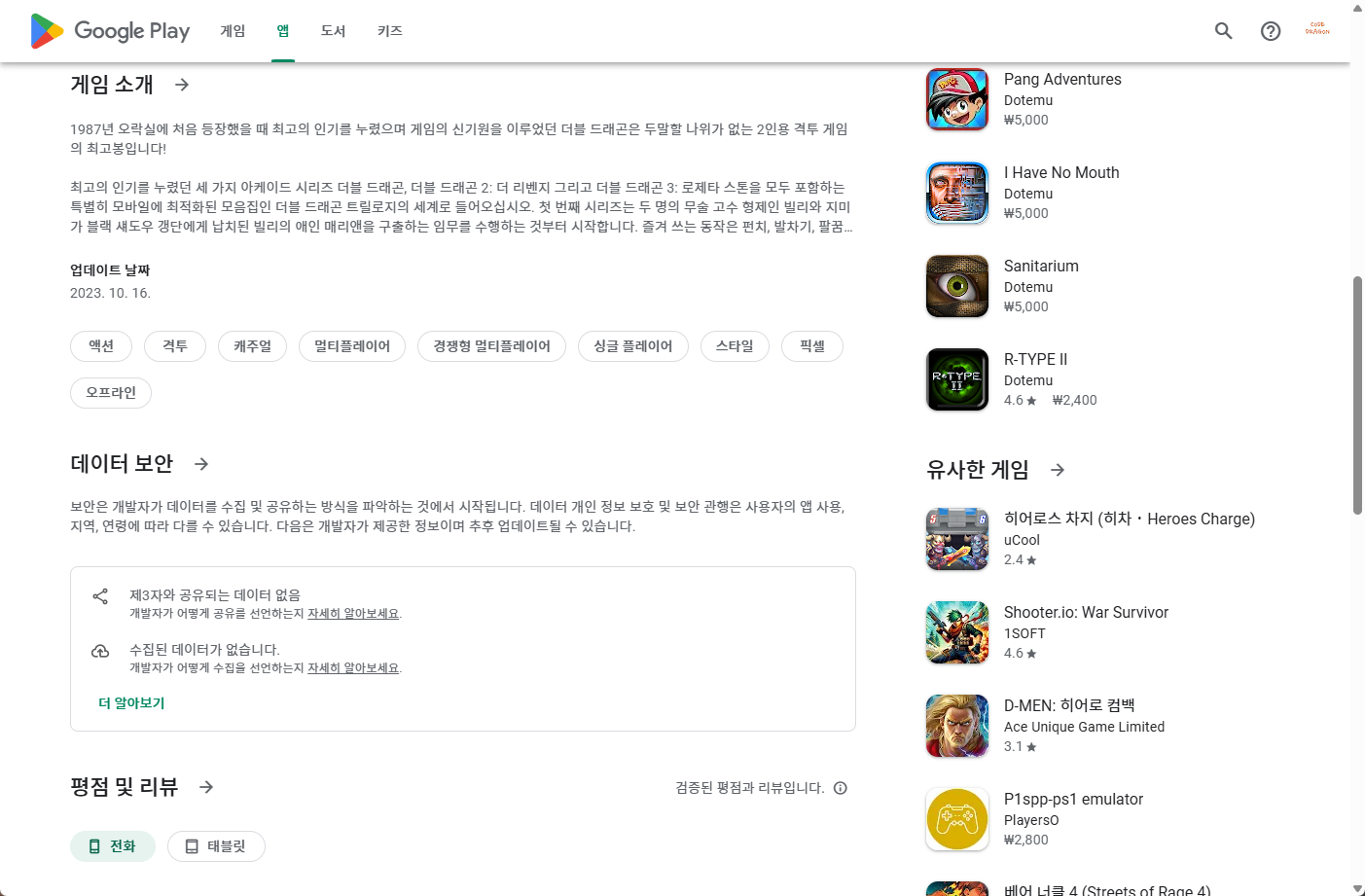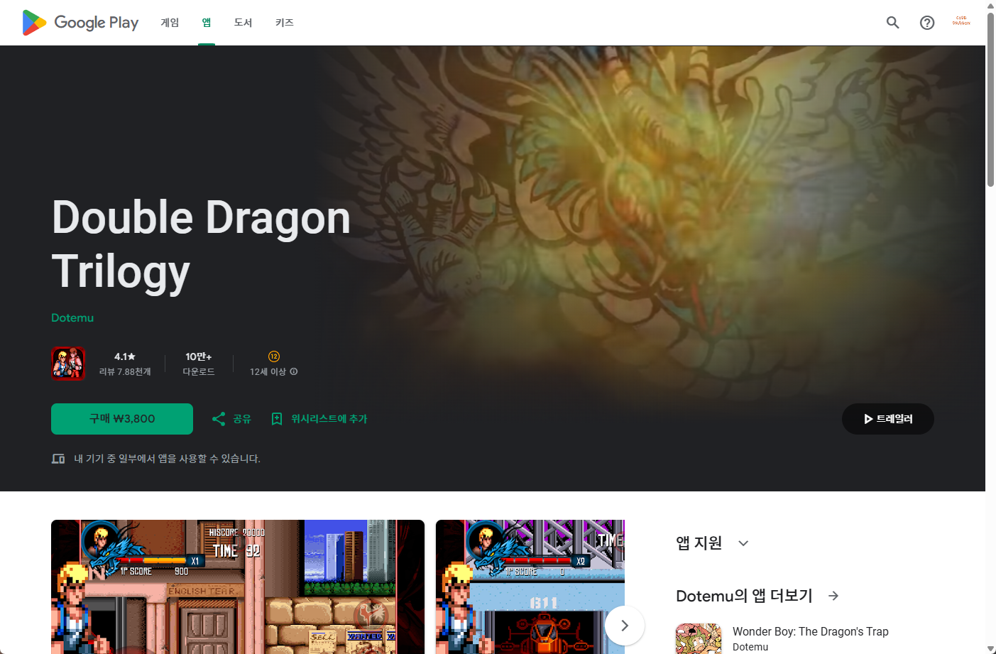 - "Double Dragon Trilogy (더블 드래곤 트릴로지)" - 구글 플레이 스토어 Google Play Store 게임 페이지