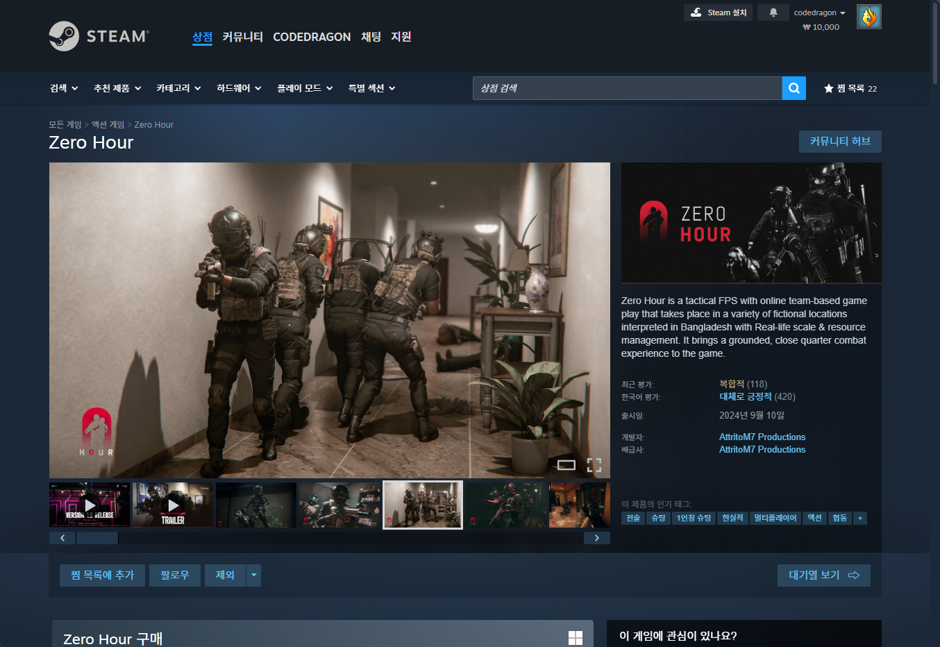 "Zero Hour (제로 아워)" - Steam 스팀 게임 페이지