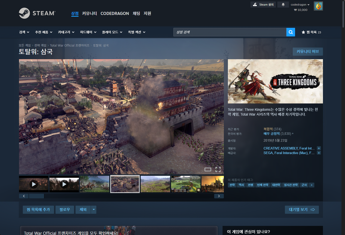 "Total War: THREE KINGDOMS (토탈 워: 삼국)" - Steam 스팀 게임 페이지