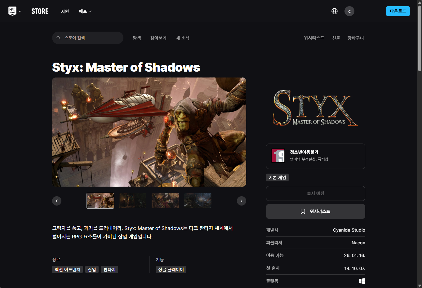 - "Styx: Master of Shadows (스틱스: 마스터 오브 쉐도우)" 에픽 무료게임 페이지