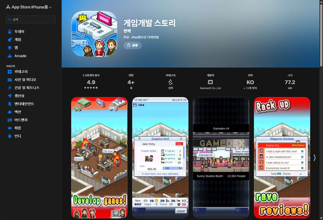 "Game Dev Story (게임개발 스토리)" 애플 앱 스토어 - iOS App Store