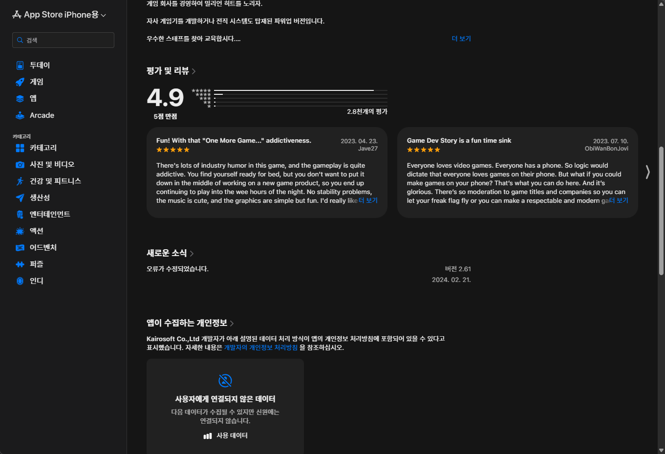 - "Game Dev Story (게임개발 스토리)" 애플 앱 스토어 - iOS App Store