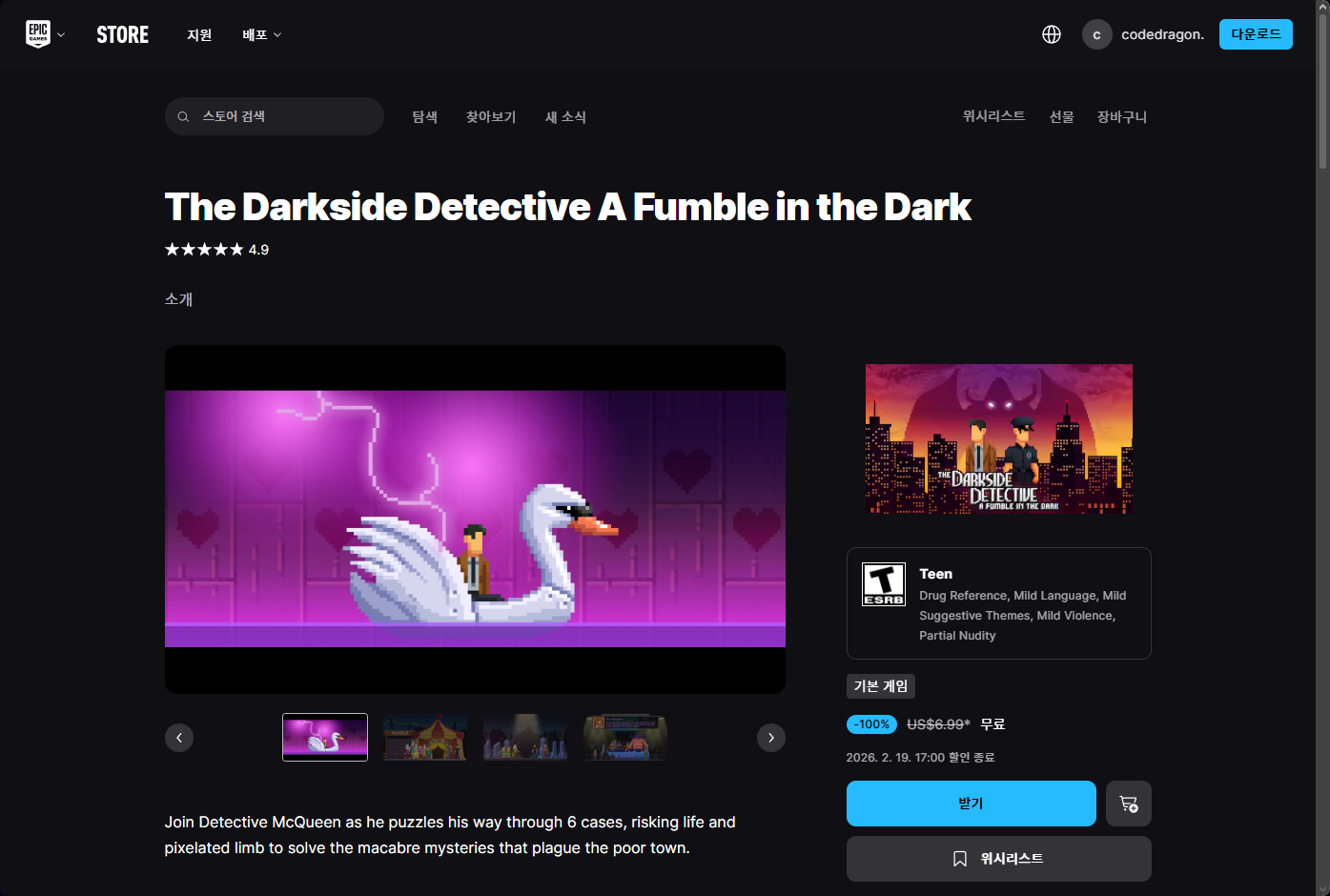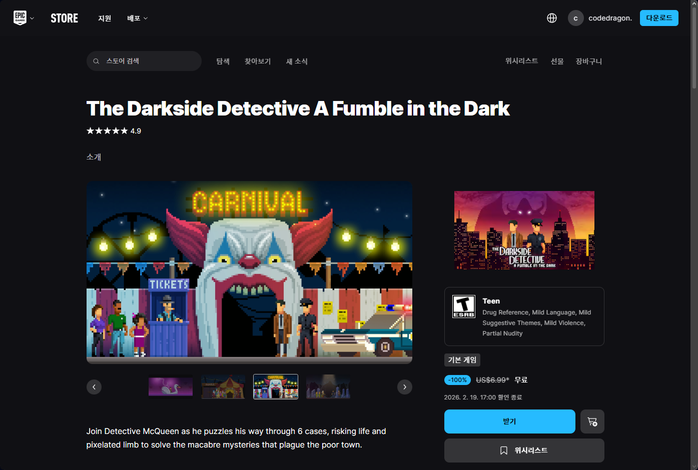 ₩9,500 → ₩0(FREE) The Darkside Detective: A Fumble in the Dark (더 다크사이드 디텍티브: 어 펌블 인 더 다크) 모바일 게임 무료 받기 영구소장; 에픽 게임즈 스토어 epic games store App EGS